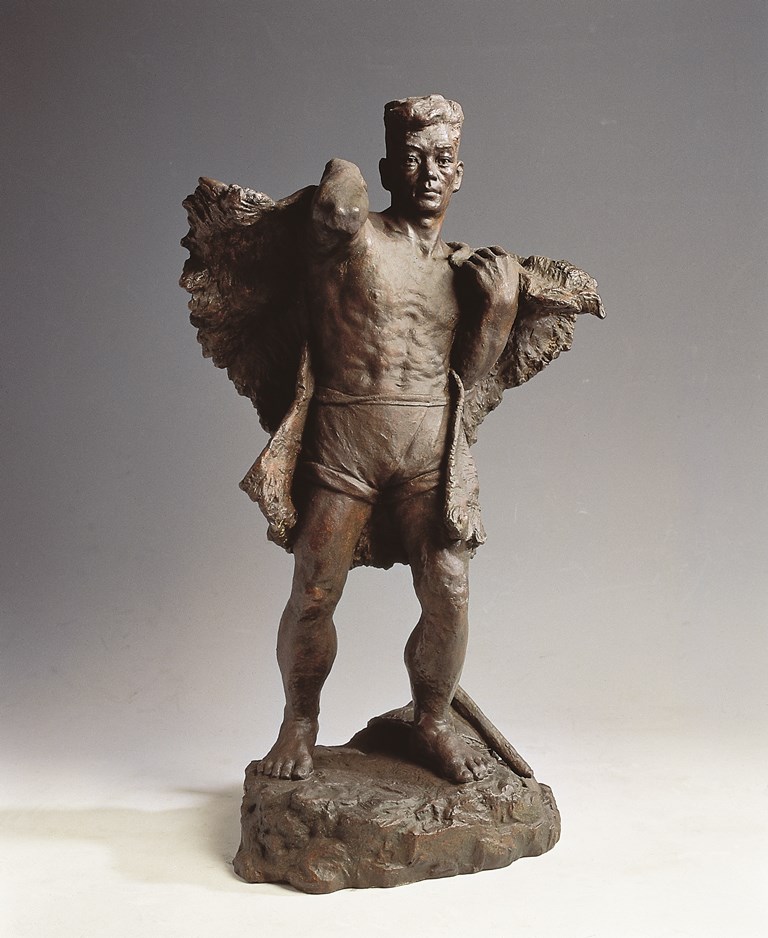 下著的雨,雙手拉搭簑衣,頸、胸、腿、臂的肌肉隨之顯得弛張,神情酷肖,充分刻畫出台灣的農